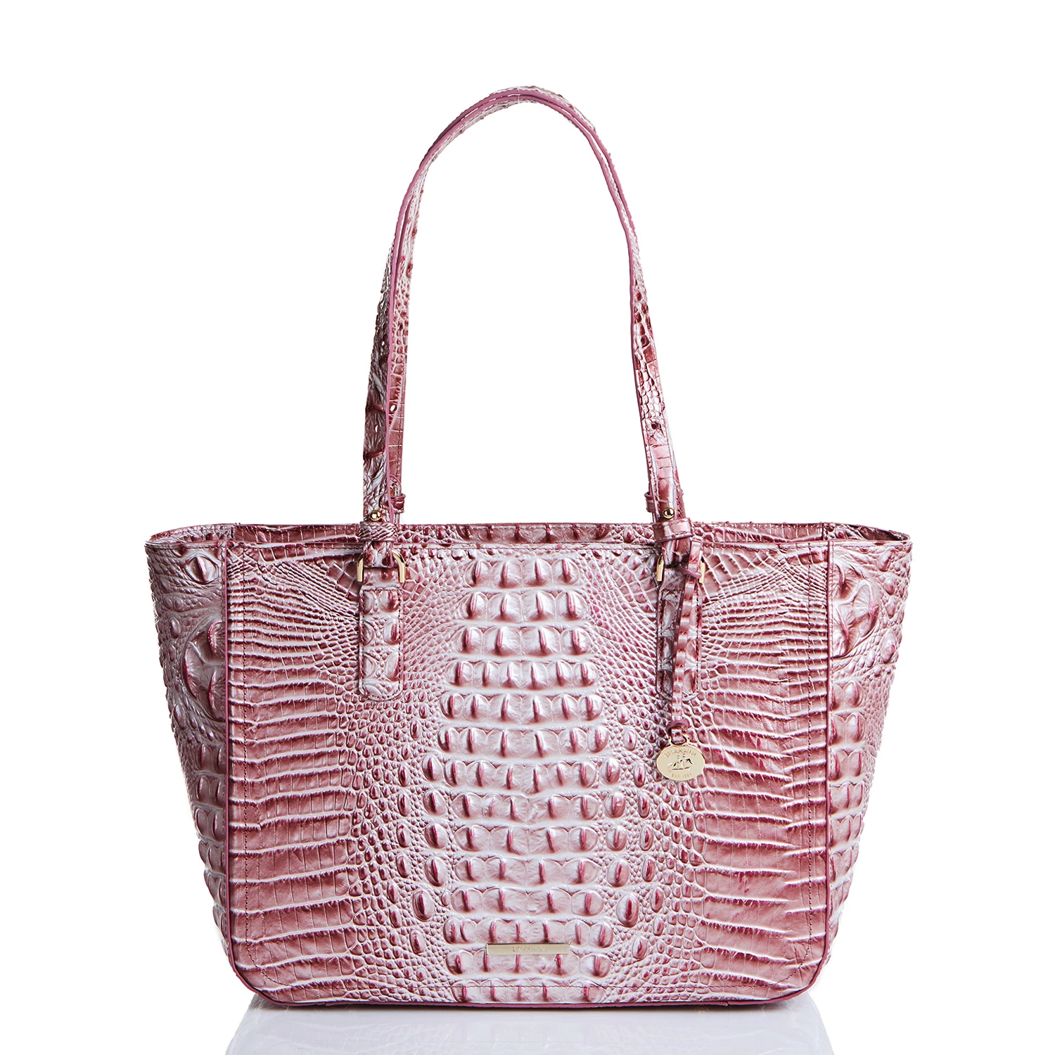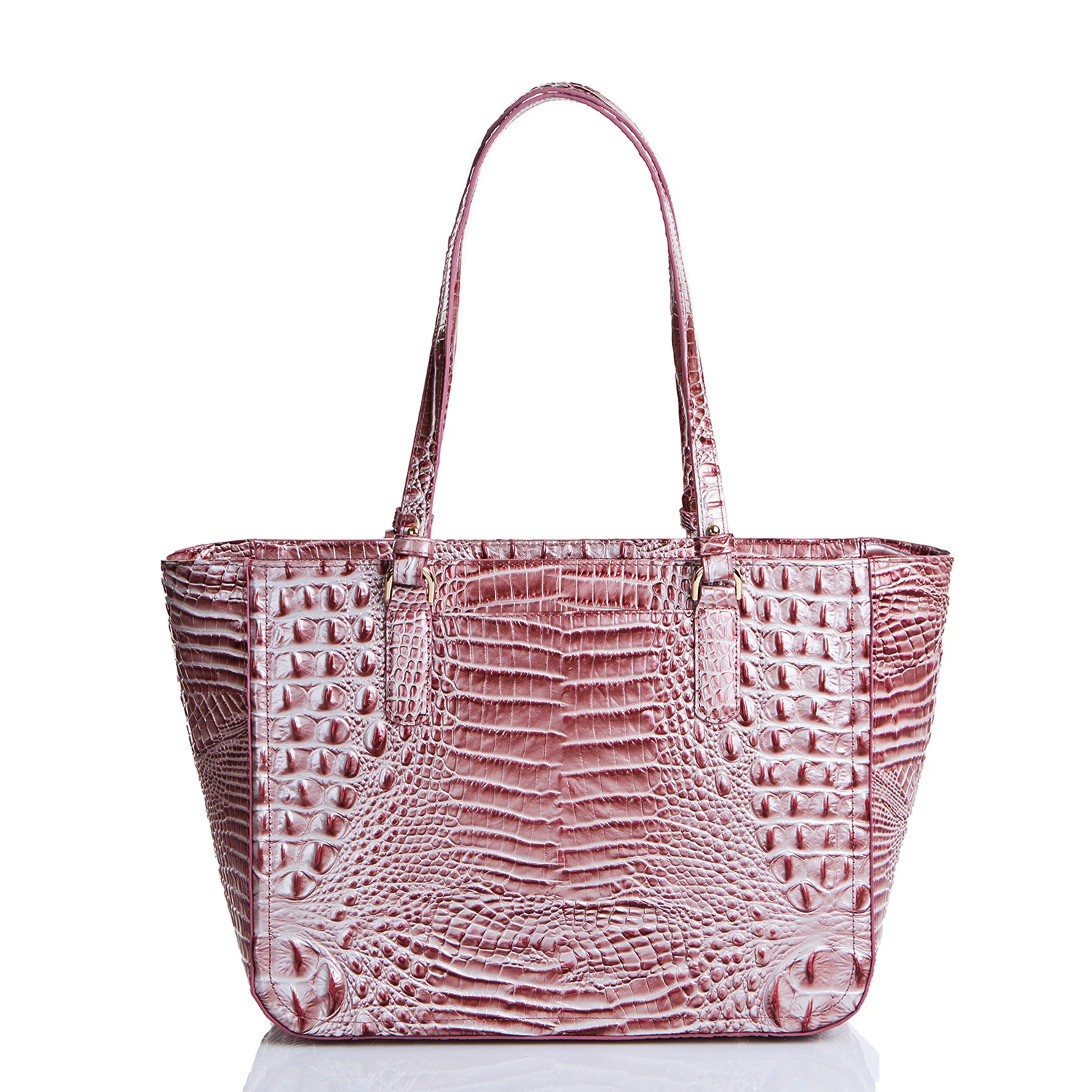 Featured in Pink Icing Melbourne, a soft, pearlescent pink. This offers a multi-dimensional pink that shines like delicate silk. Made with genuine croc-embossed leather.