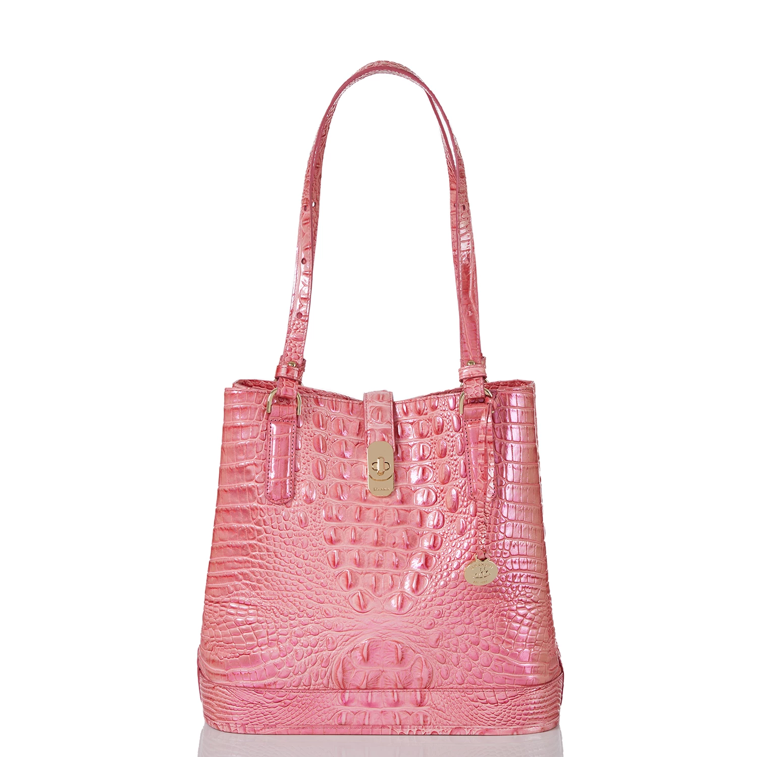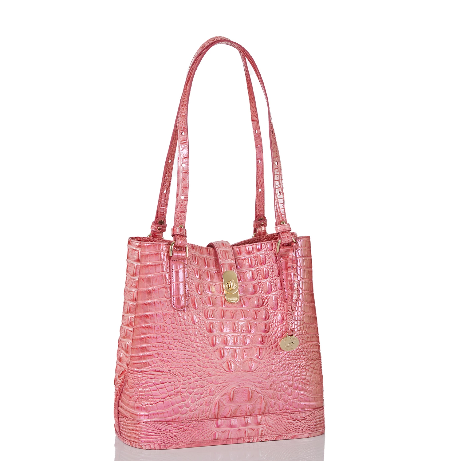 Featured in Pink Punch Melbourne, a refreshing coral pink with an iridescent shine. This is our fresh twist on a trending color palette of the season. The soft, coral pink takes on a new look with the iridescent foil that brings just a hint of shine. Made with genuine croc-embossed leather.
