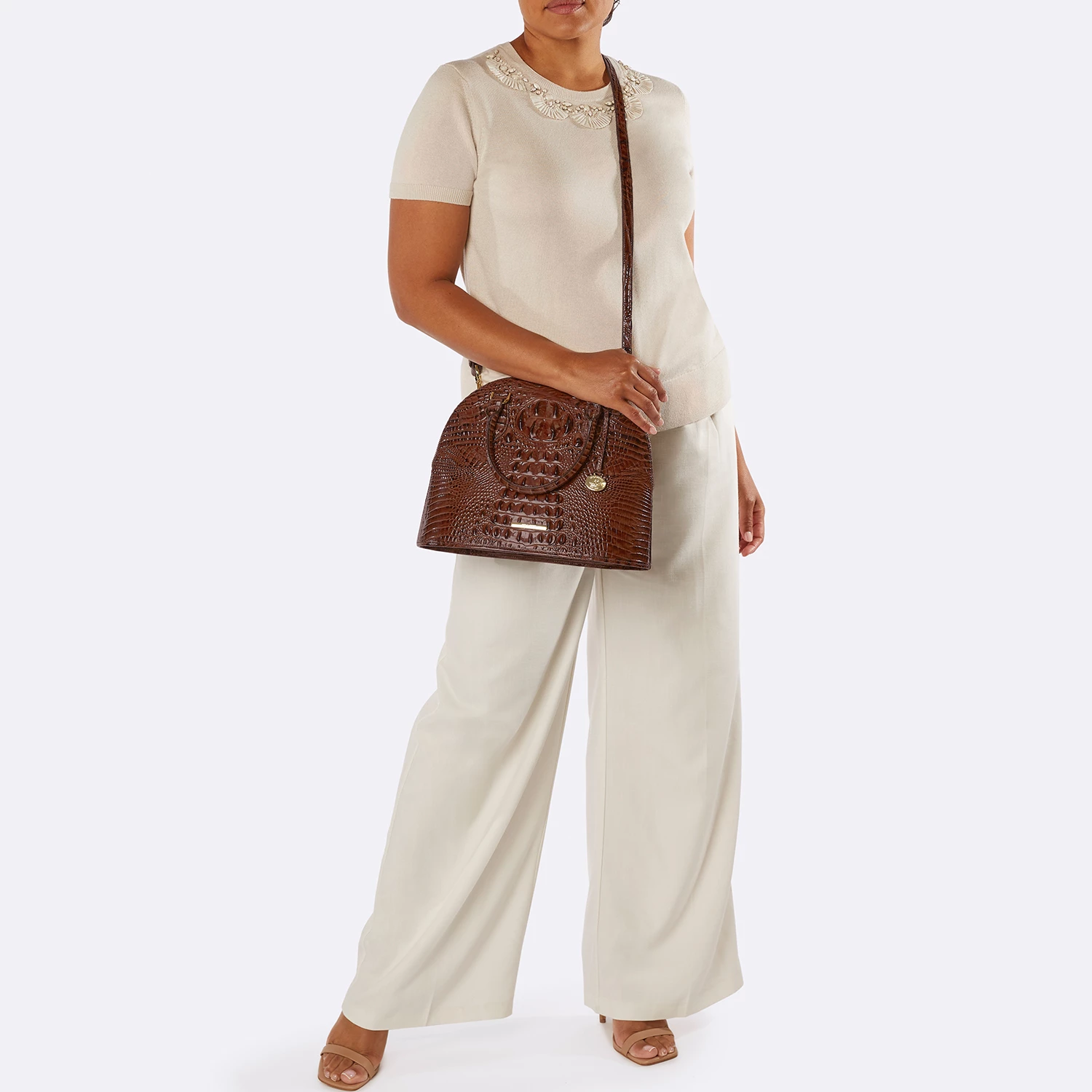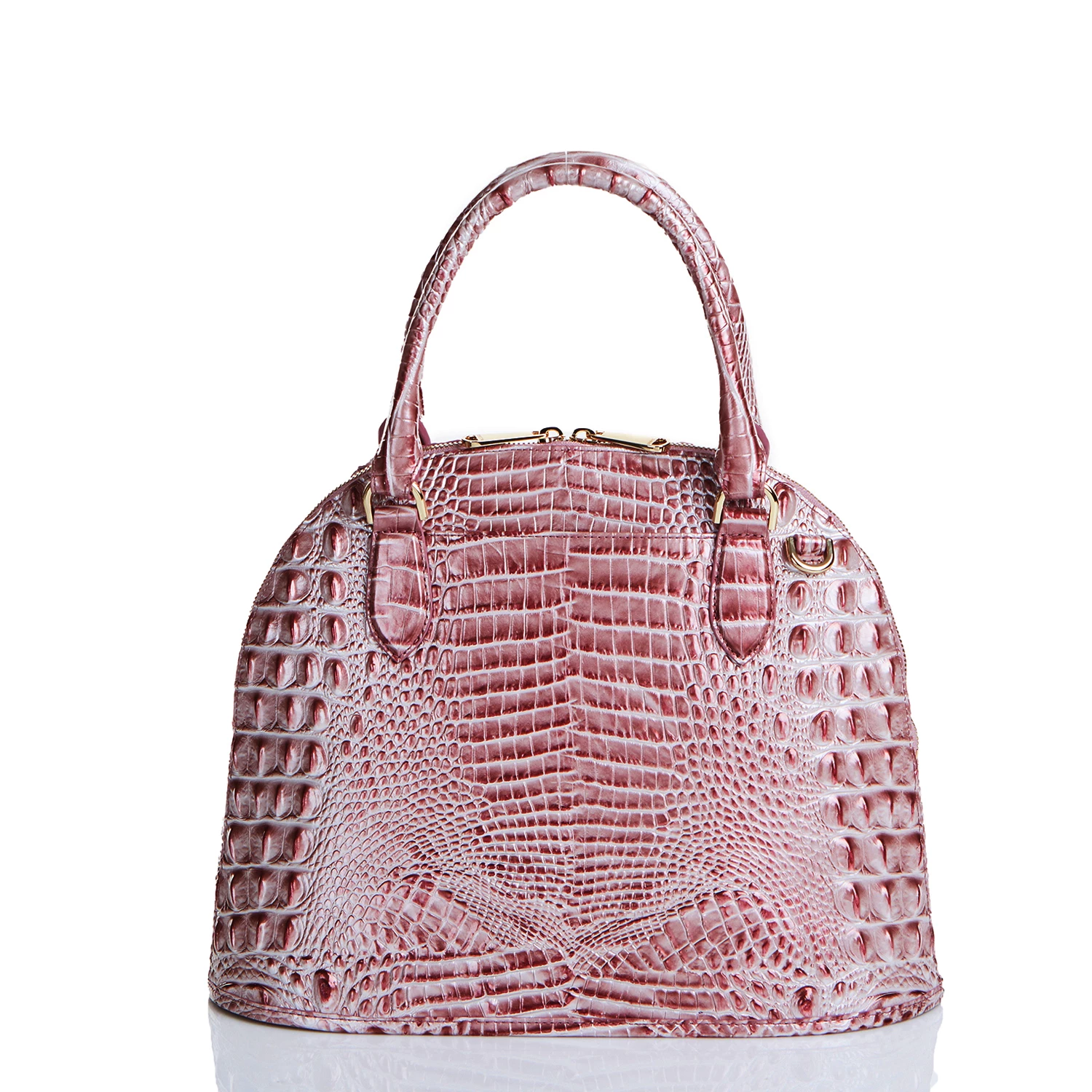 Featured in Pink Icing Melbourne, a soft, pearlescent pink. This offers a multi-dimensional pink that shines like delicate silk. Made with genuine croc-embossed leather.