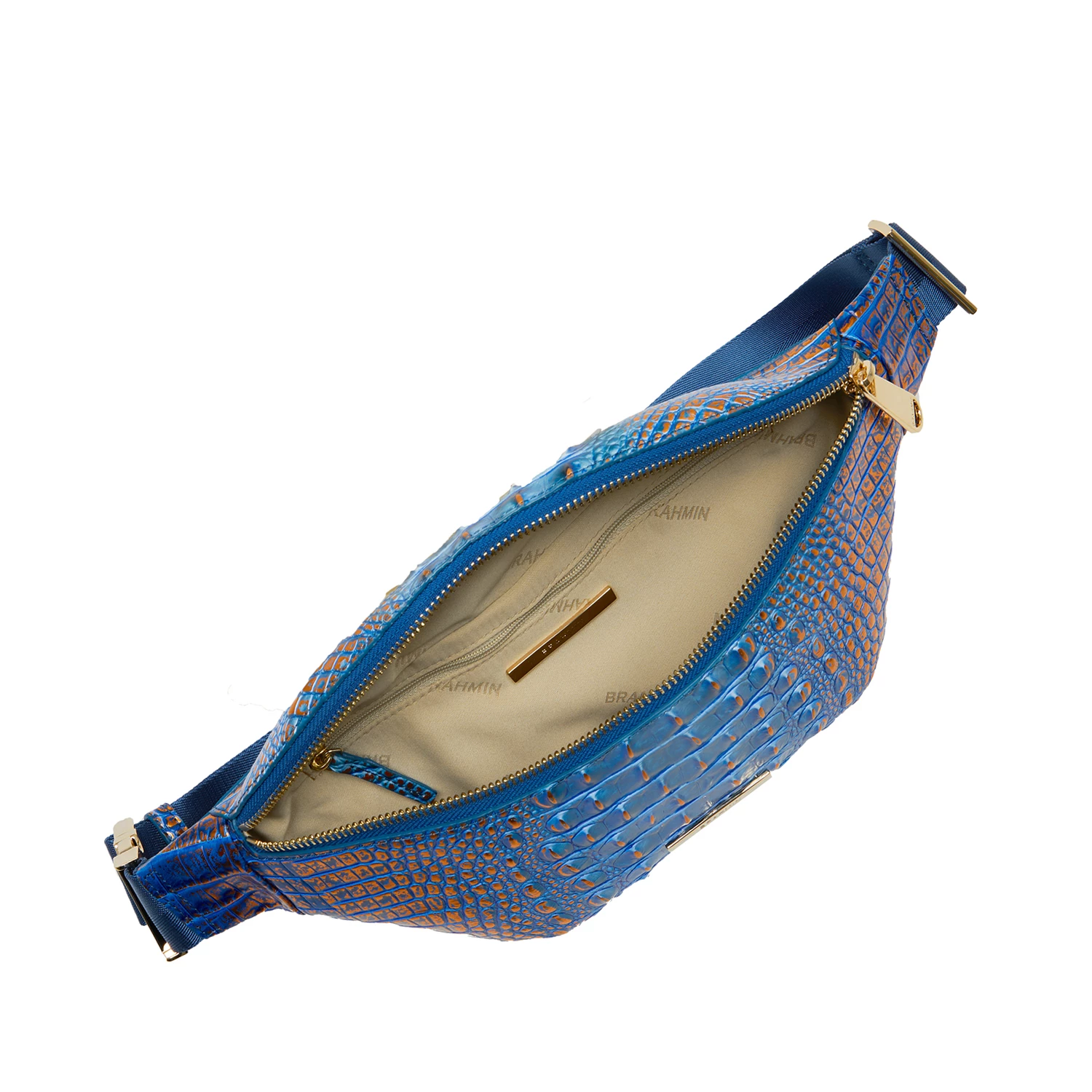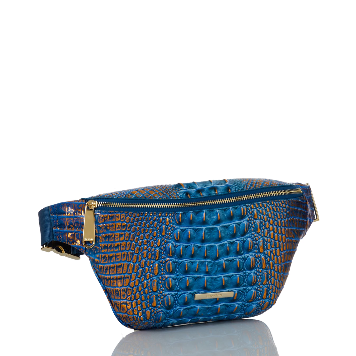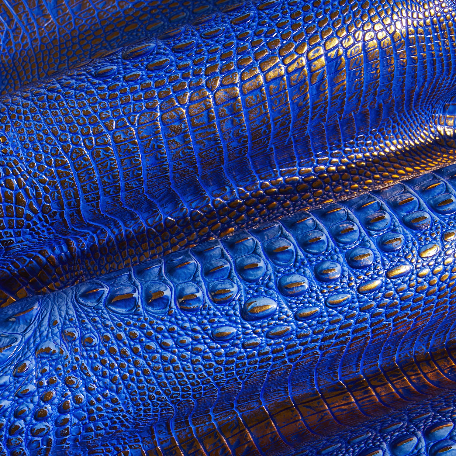 Featured in Deep Azure Melbourne, a saturated, dynamic blue. This deep, dazzling blue is accented with a copper metallic shimmer that brings eye-catching shine to warmer weather. Made with genuine croc-embossed leather.