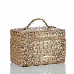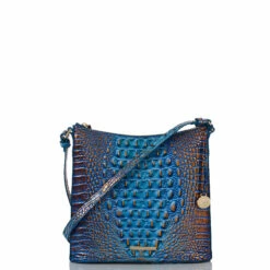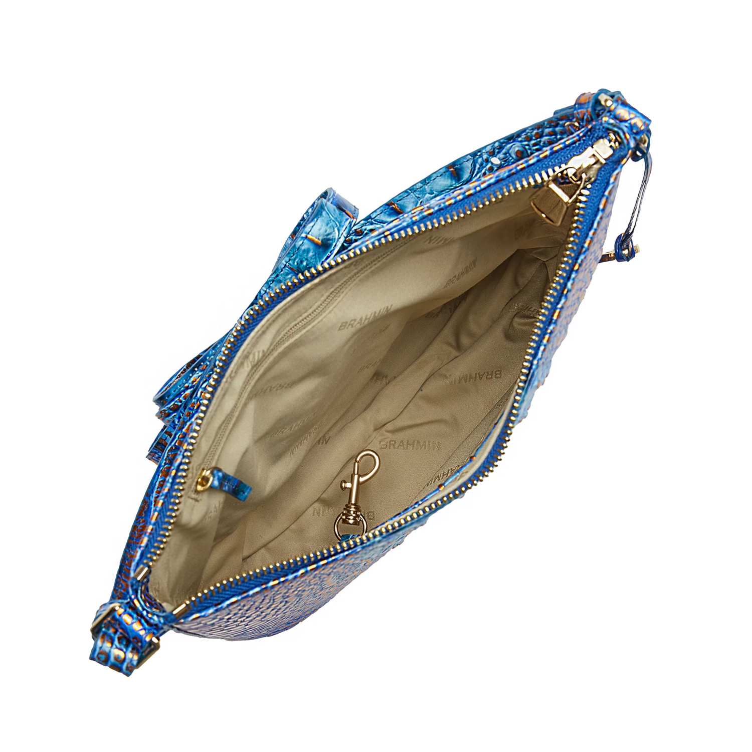 Featured in Deep Azure Melbourne, a saturated, dynamic blue. This deep, dazzling blue is accented with a copper metallic shimmer that brings eye-catching shine to warmer weather. Made with genuine croc-embossed leather.