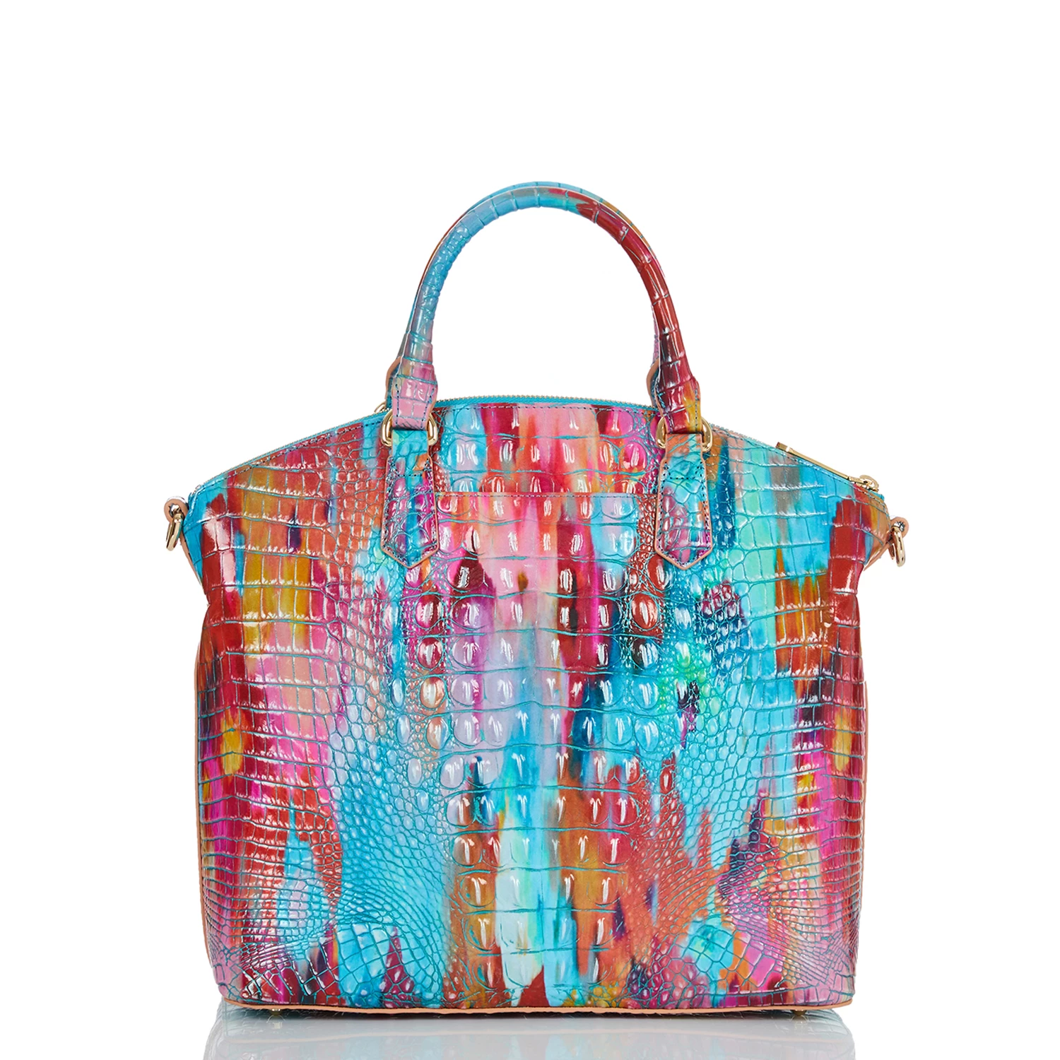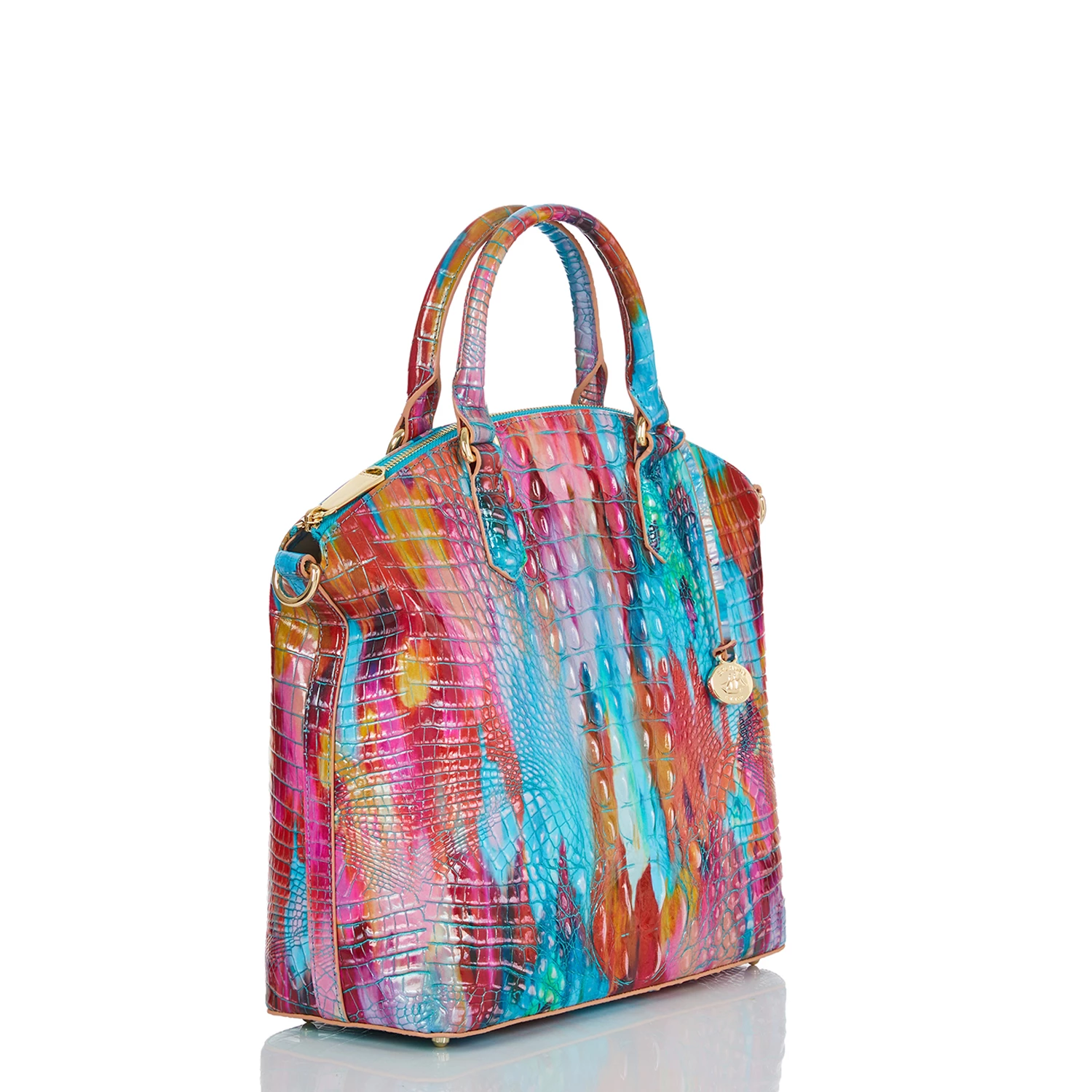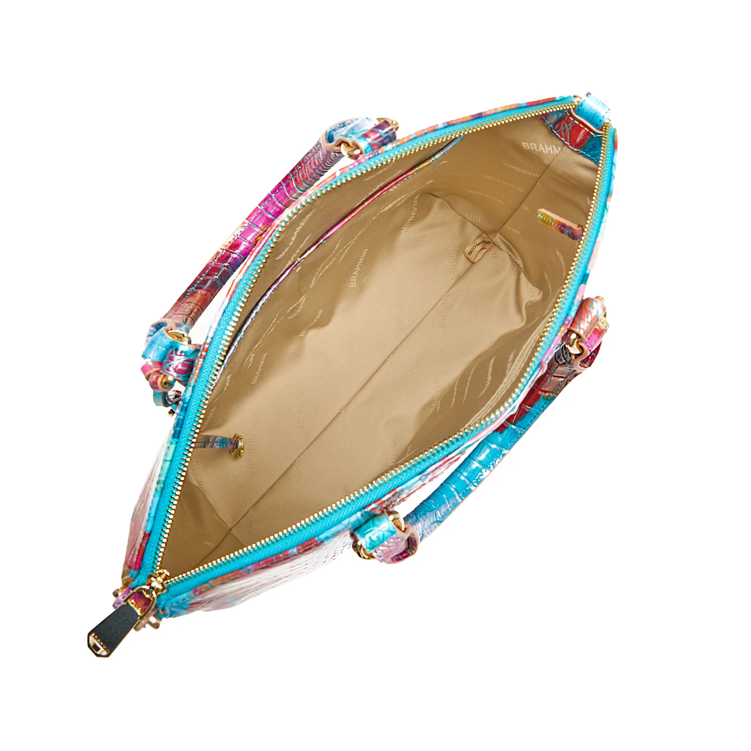 Featured in Fanciful Melbourne, an abstract print that brings the bold, exuberant energy of summer to life with saturated colors. The vibrant mix of electric turquoise and hot pink is a lively expression of creativity while the touch of silver instantly elevates. Made with genuine croc-embossed leather. Due to the nature of the materials used, each Brahmin product is one-of-a-kind. Variances in the pattern and texture of your bag may occur.