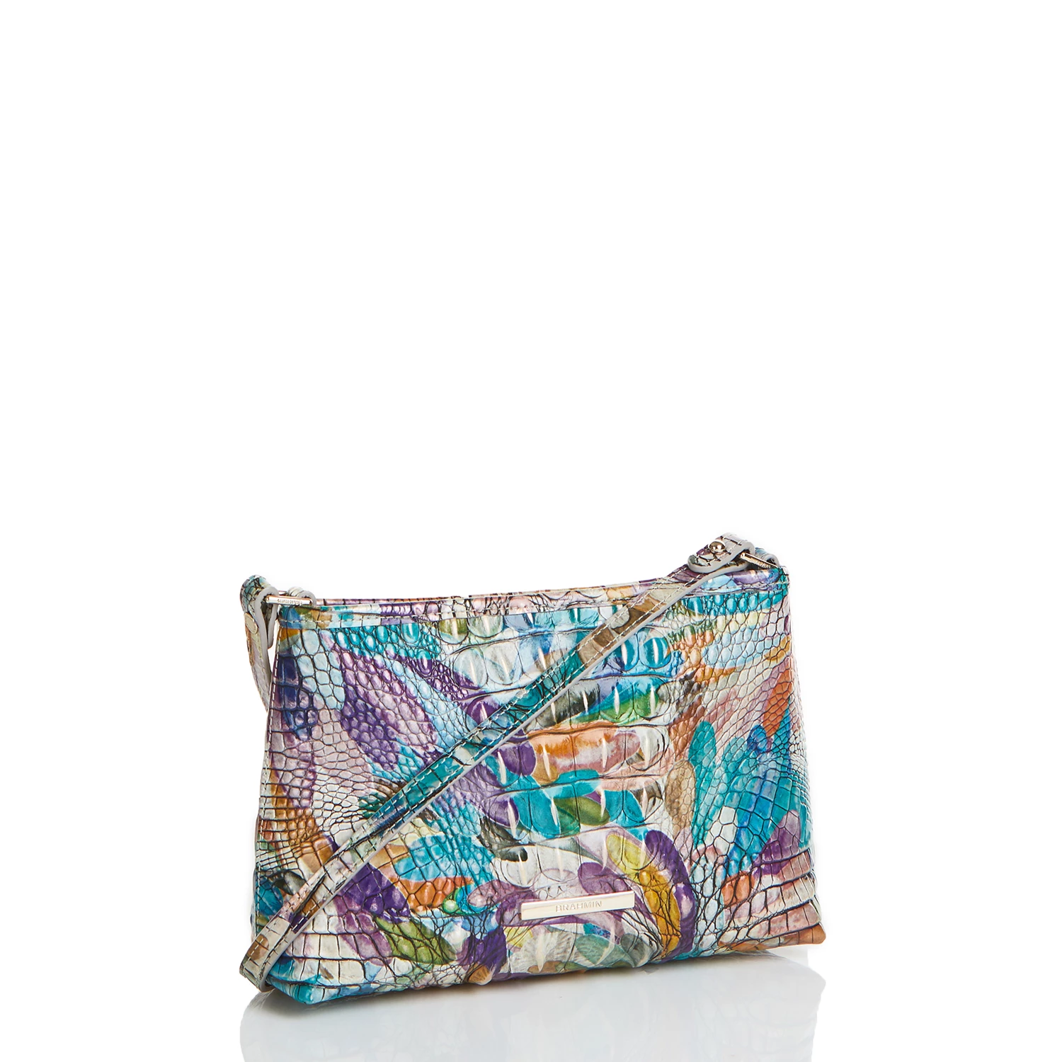 Featured in Flourish Melbourne, a dynamic print that features gorgeous petals blooming with life in pink, teal, amber, and deep purple tones. Made with genuine croc-embossed leather.