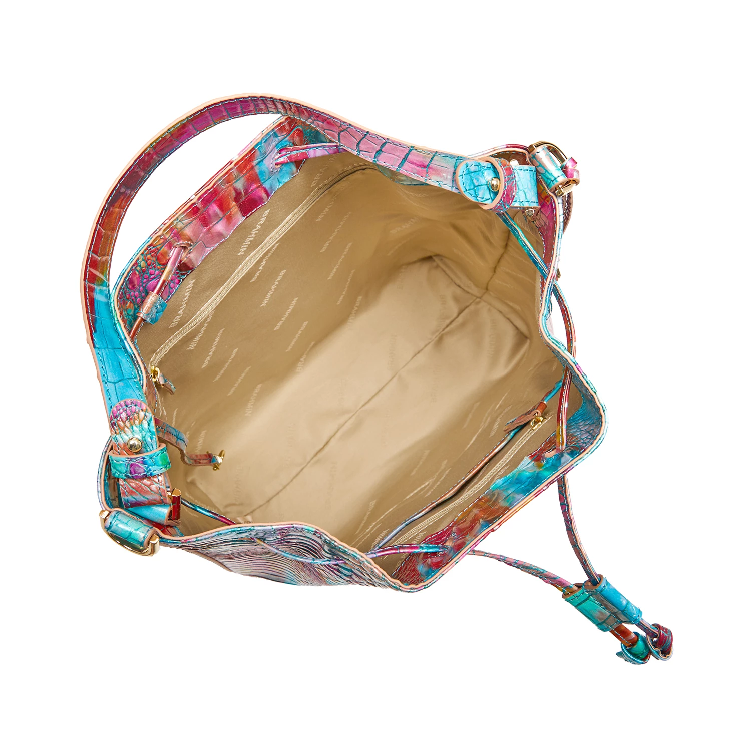 Featured in Fanciful Melbourne, an abstract print that brings the bold, exuberant energy of summer to life with saturated colors. The vibrant mix of electric turquoise and hot pink is a lively expression of creativity while the touch of silver instantly elevates. Made with genuine croc-embossed leather. Due to the nature of the materials used, each Brahmin product is one-of-a-kind. Variances in the pattern and texture of your bag may occur.