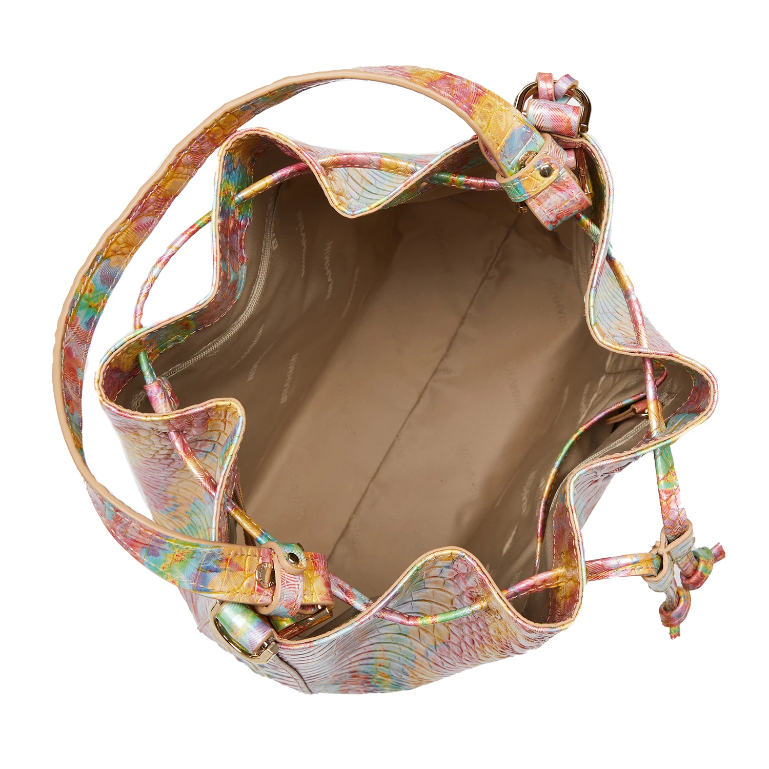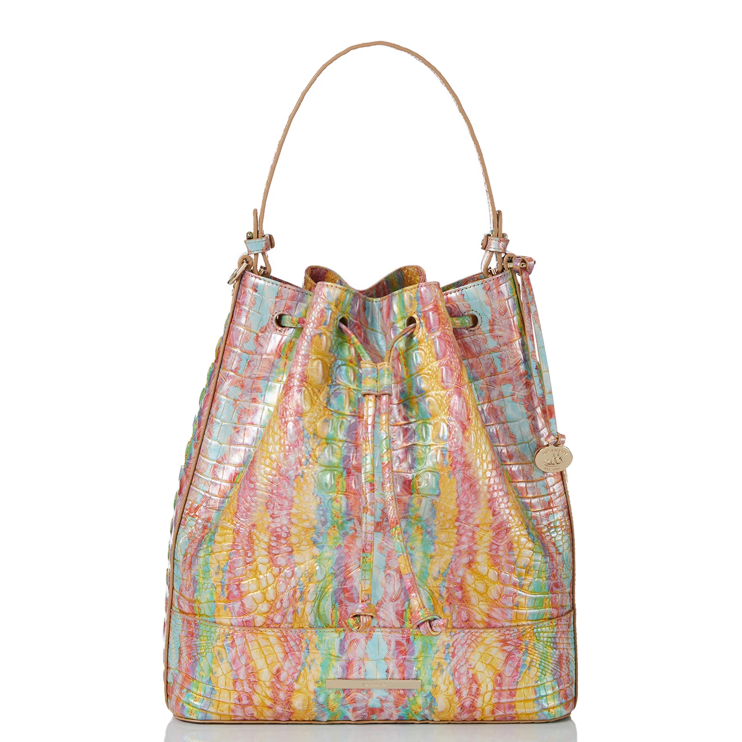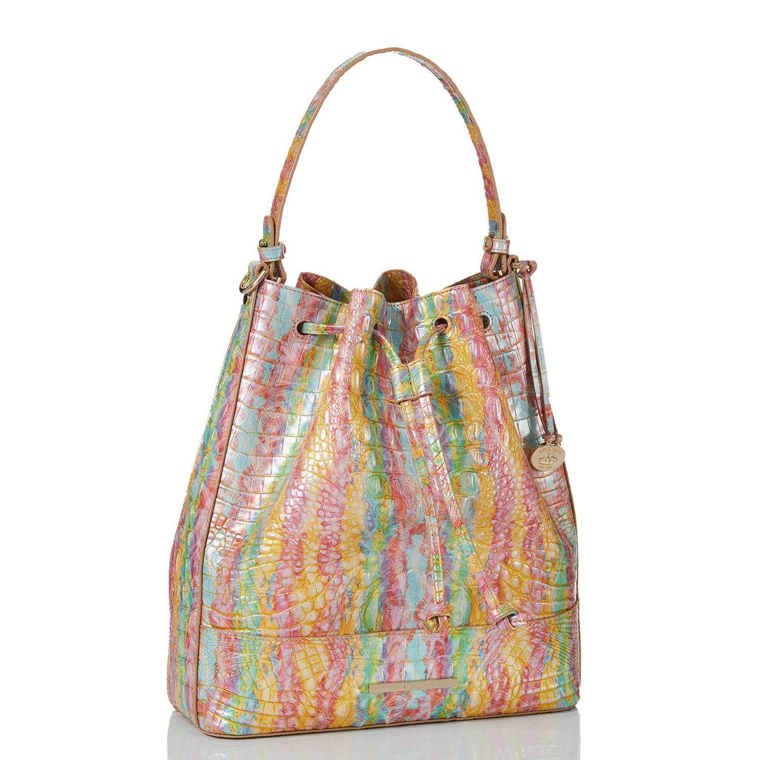Featured in Saltwater Taffy Melbourne, an energetic abstract print. This brings together all of our favorite colors of the season. The soft green, buttery yellow, and sky-blue work together to create a mood-boosting print. Made with genuine croc-embossed leather.