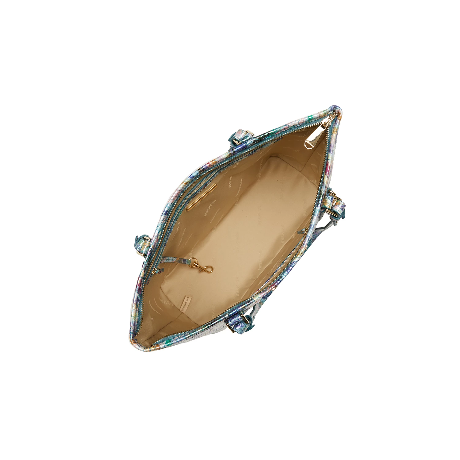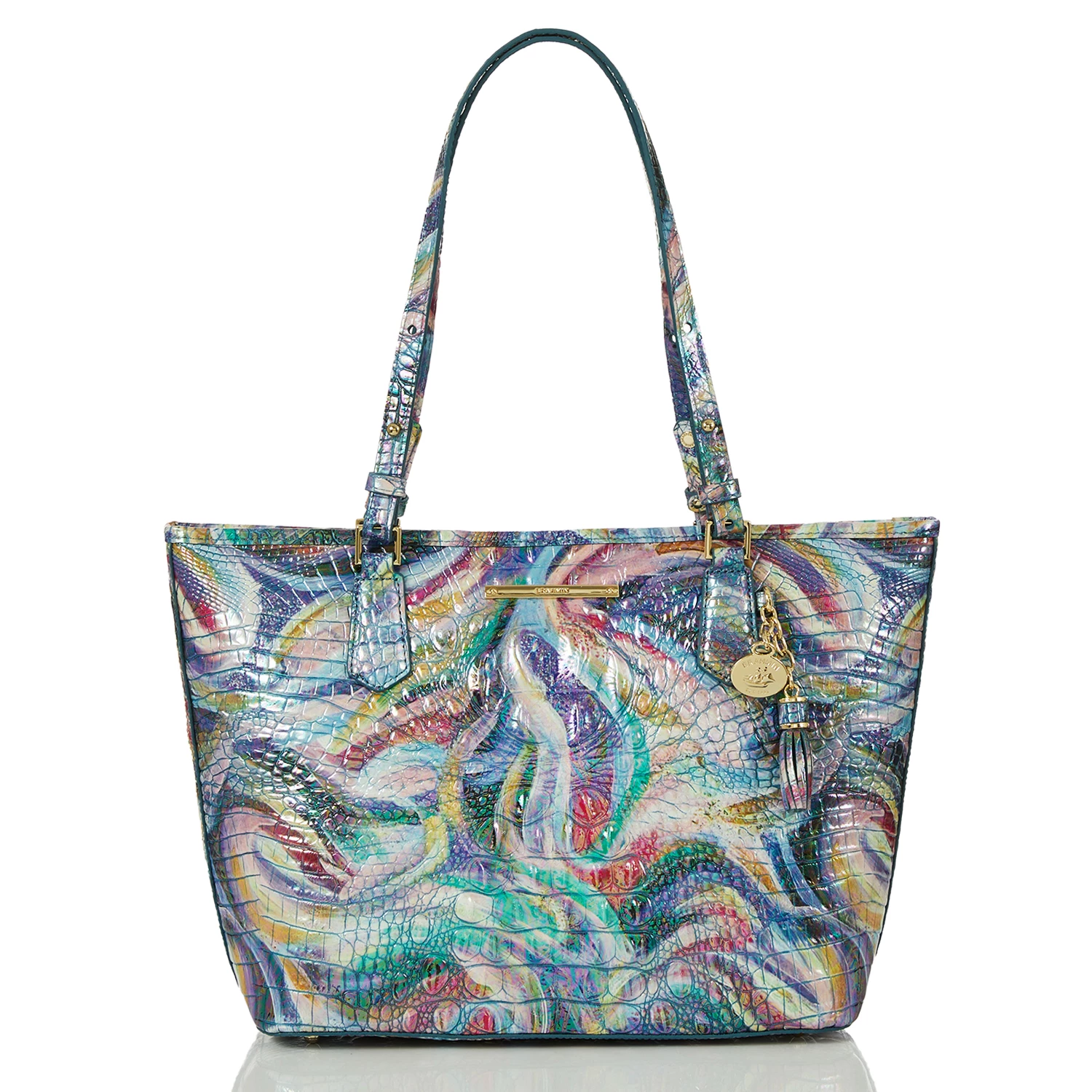Featured in Elope Melbourne, a creative combination of color designed to ignite the imagination. Enter a world of whimsy with this playful print that has iridescent shine bringing a glow to the season. Made with genuine croc-embossed leather.