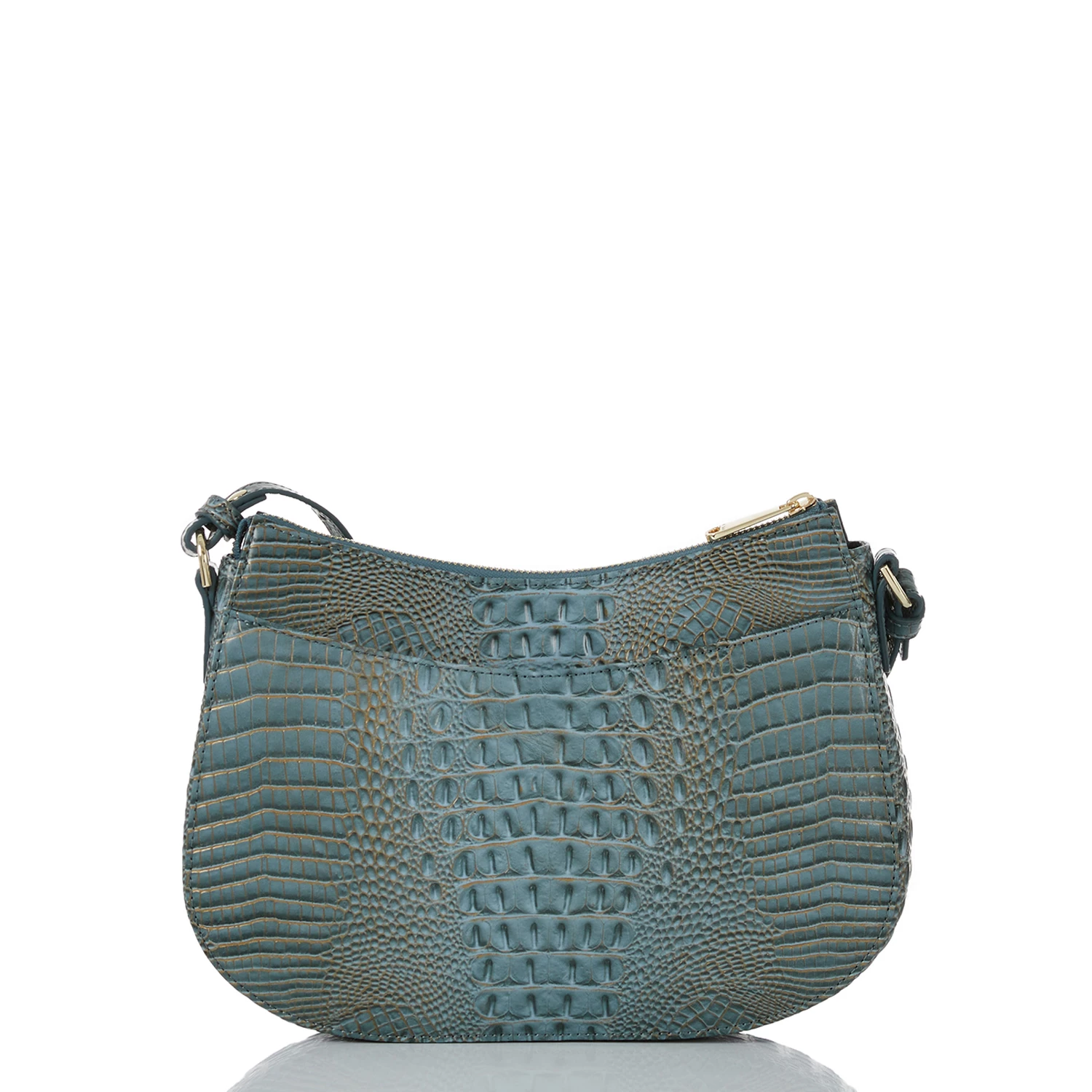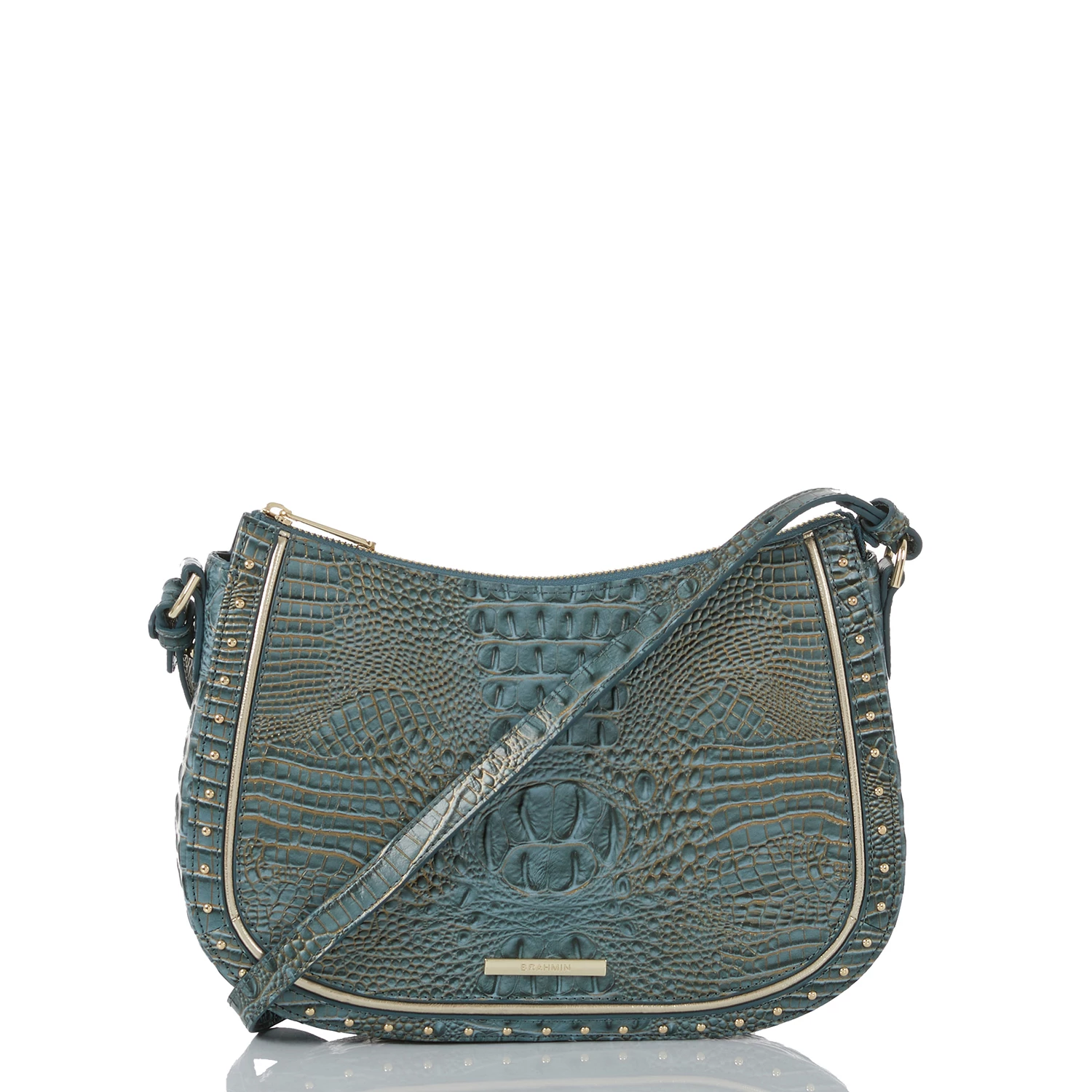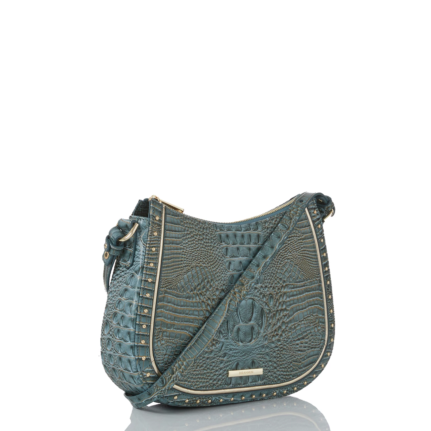 Featured in Slate Stratos, a wearable new slate blue. This mini Melbourne has a satin finish and the leather has a softer hand feel for a casual appeal. Slate Stratos is elevated with hints of gold shimmer and a smooth gold trim. The small stud detailing gives this a casual-cool ease that feels on-trend. Made with genuine leather.