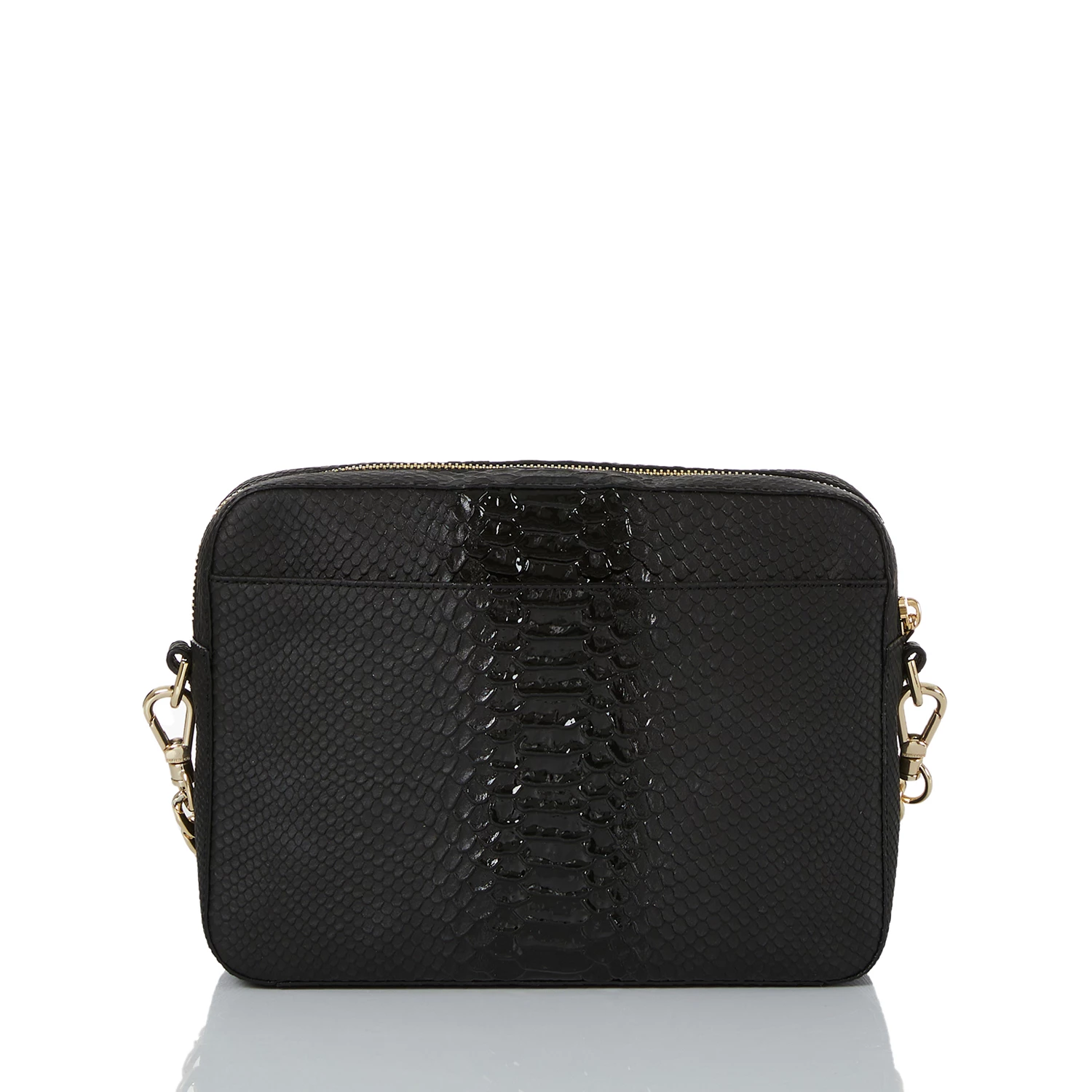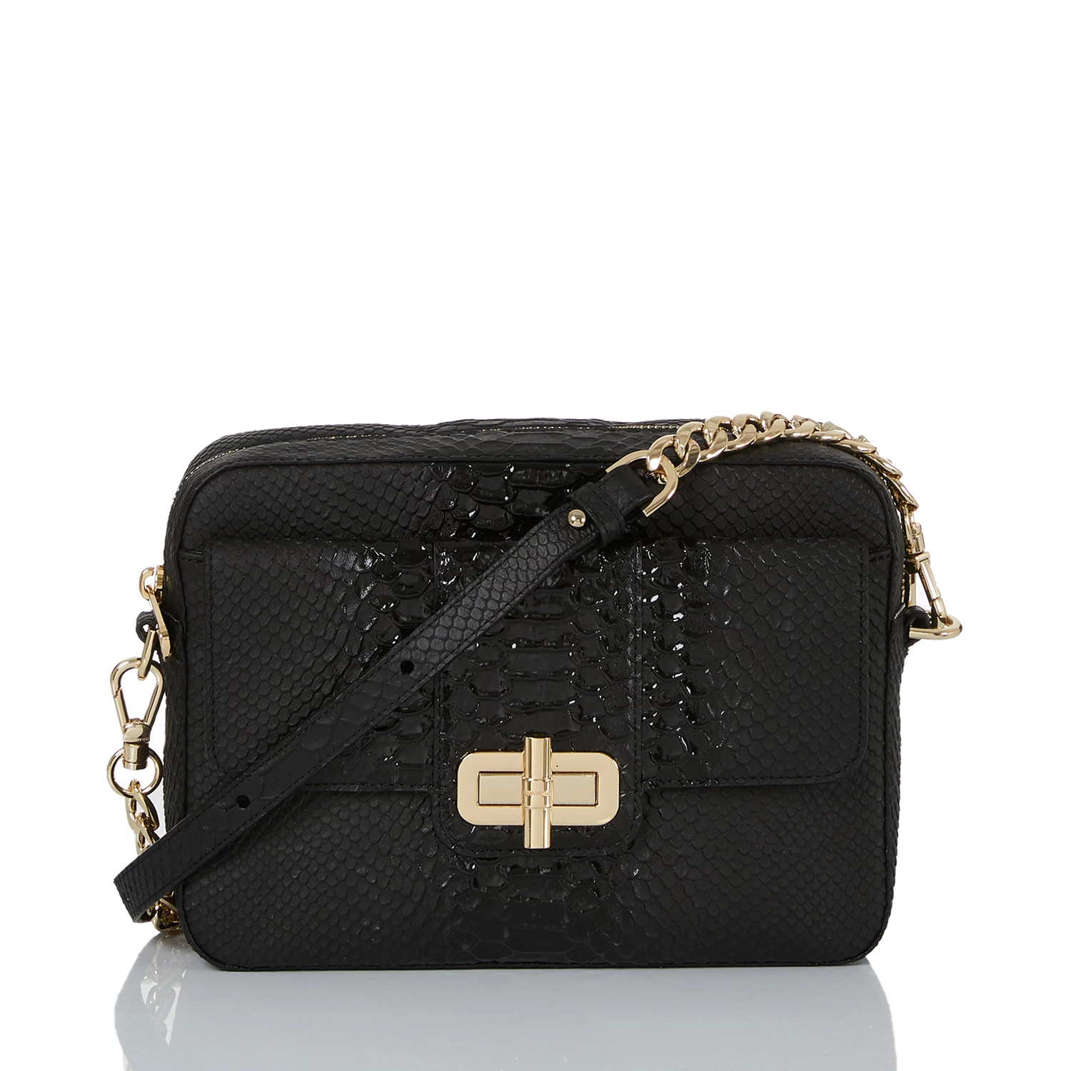 Featured in Black Harkness, a gorgeous snake with a rich matte black that transitions to a high gloss shine in the center. Select styles are elevated with a chain detail and a new statement turnlock. Made with genuine leather.