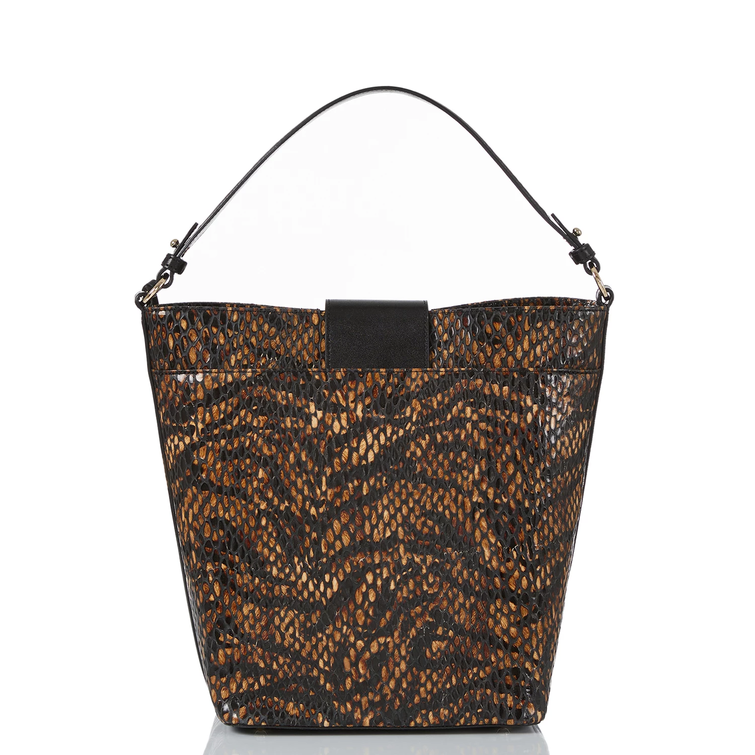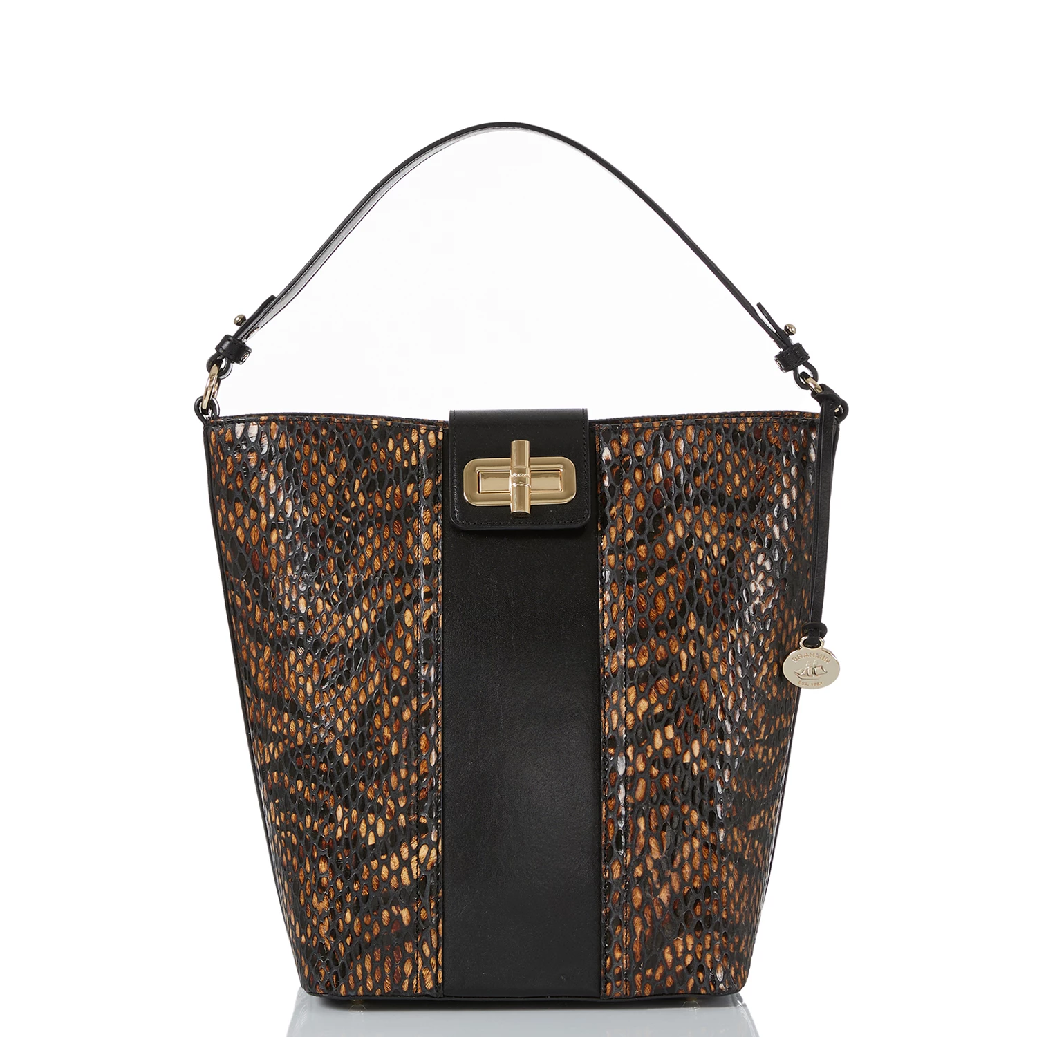 Featured in Cocoa Blanchard, an elevated animal print, featuring a rich tiger stripe on snake, paired with an Italian black smooth leather. It is detailed in a modern color block layout with elegant quilted details. Made with genuine leather.