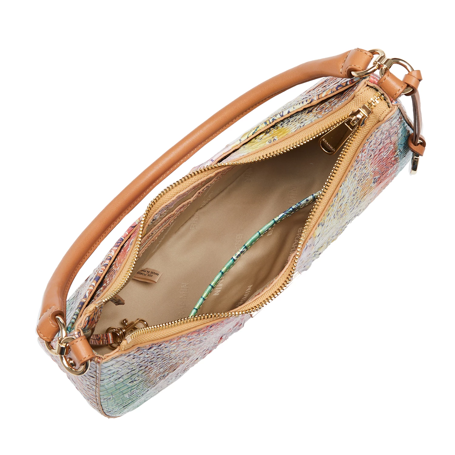 Featured in Multi Bandana, a classic bandana print with a Brahmin twist. The Americana-inspired design is infused with a joyful array of color and navy blue accents. This playful print adds a whimsical energy to the season for every summer adventure. Made with genuine croc-embossed leather.