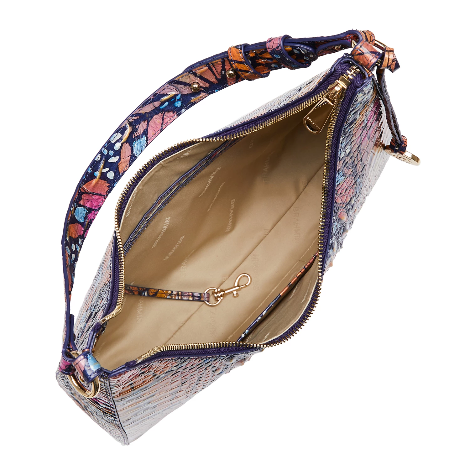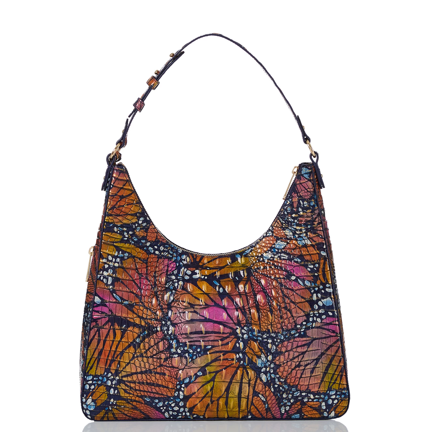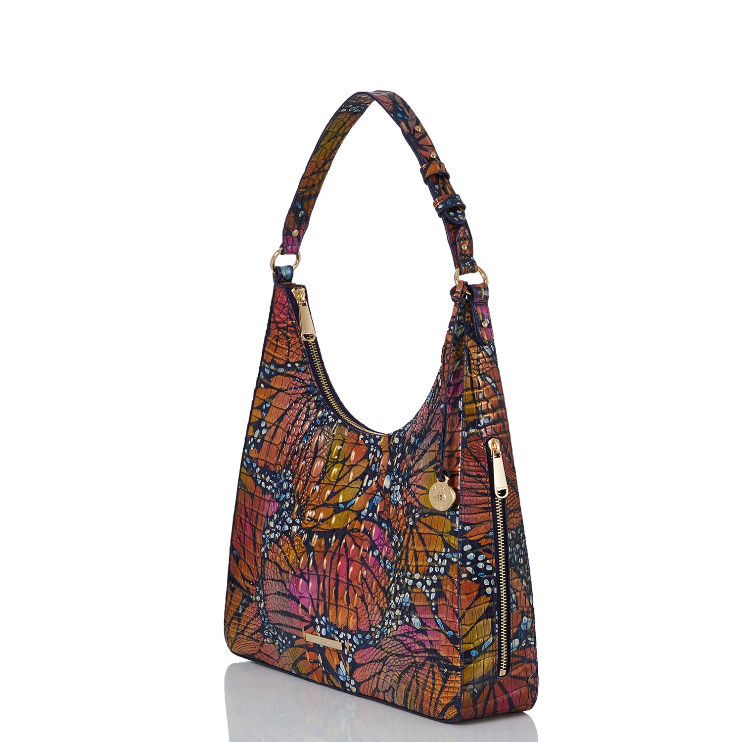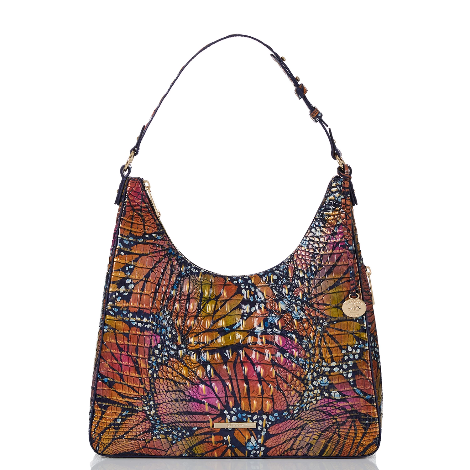 Featured in Flutter Melbourne, a whimsical, imaginative print that will instantly brighten your mood. The combination of bold and warm colors captures the playfulness of the season while the navy base allows for effortless versatility. Made with genuine croc-embossed leather.